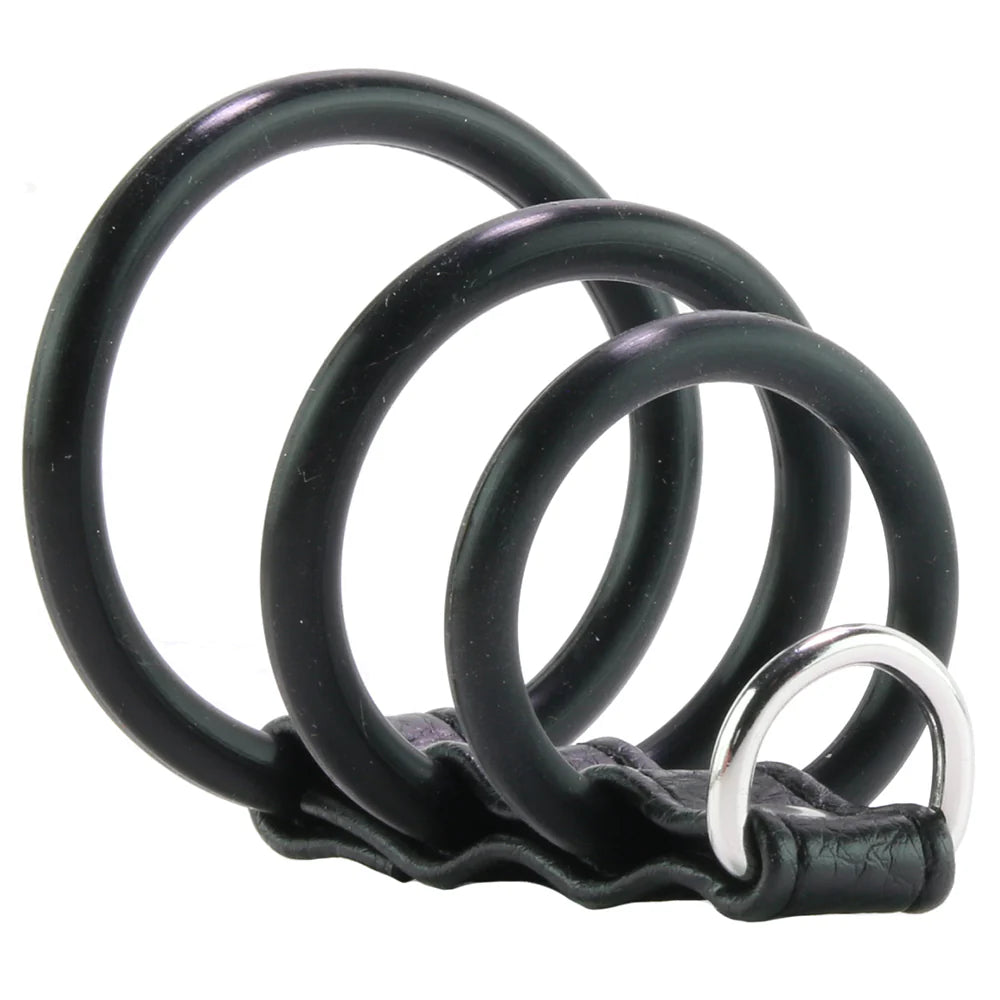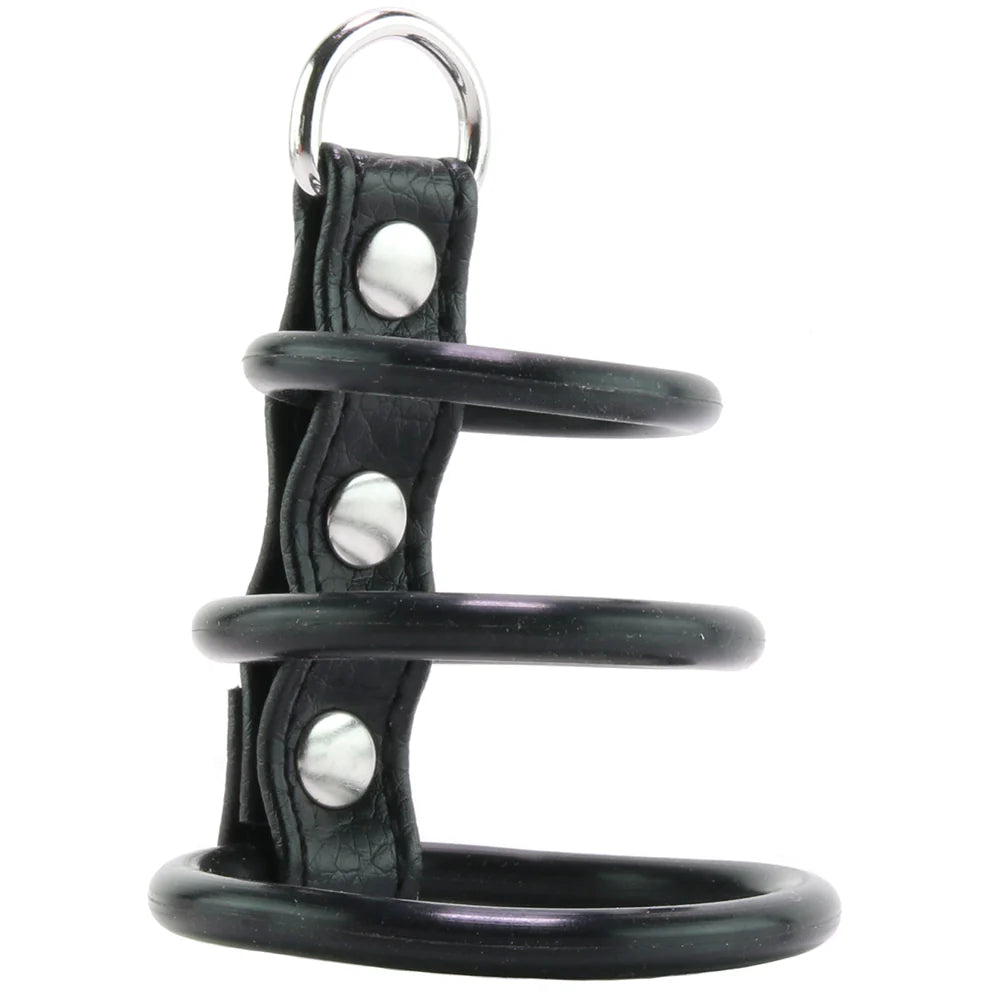 This sturdy, great-looking silicone tool features three strategically positioned, size-graduated rings joined by a soft leatherette (PVC) strap. It firmly contains the shaft and is meant to be worn with the largest ring looped around the testicles.