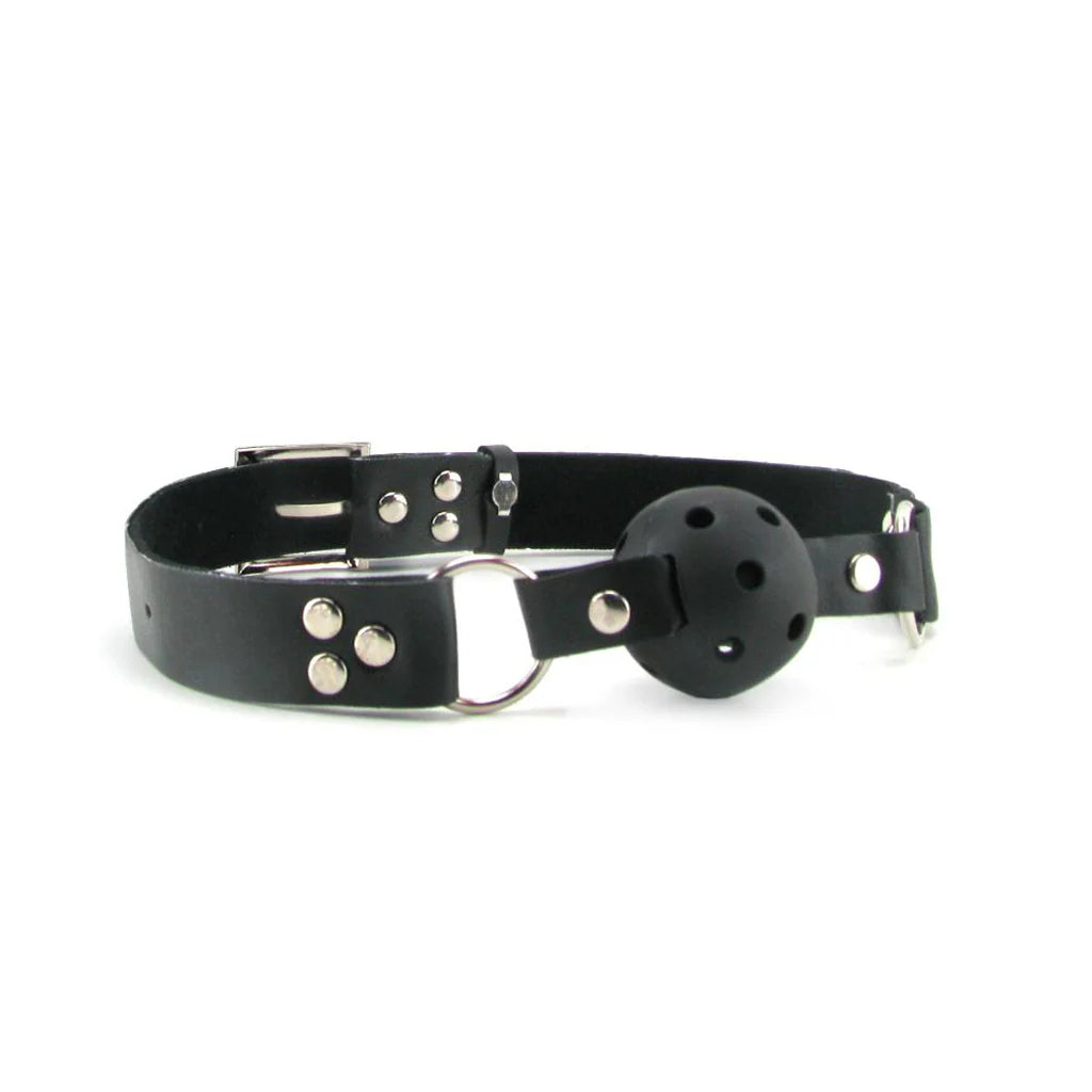 The perforated ball ensures steady airflow for the wearer, making it ideal for those new to gag play. It restricts speech while keeping things breathable and safe. Wrapped in faux leather, the adjustable 10โ strap is lined with plush fuzz for maximum comfort during long, intense sessions. Reinforced with sturdy metal rings and rivets, this non-toxic gag delivers the look and the feel of a premium bondage accessory.