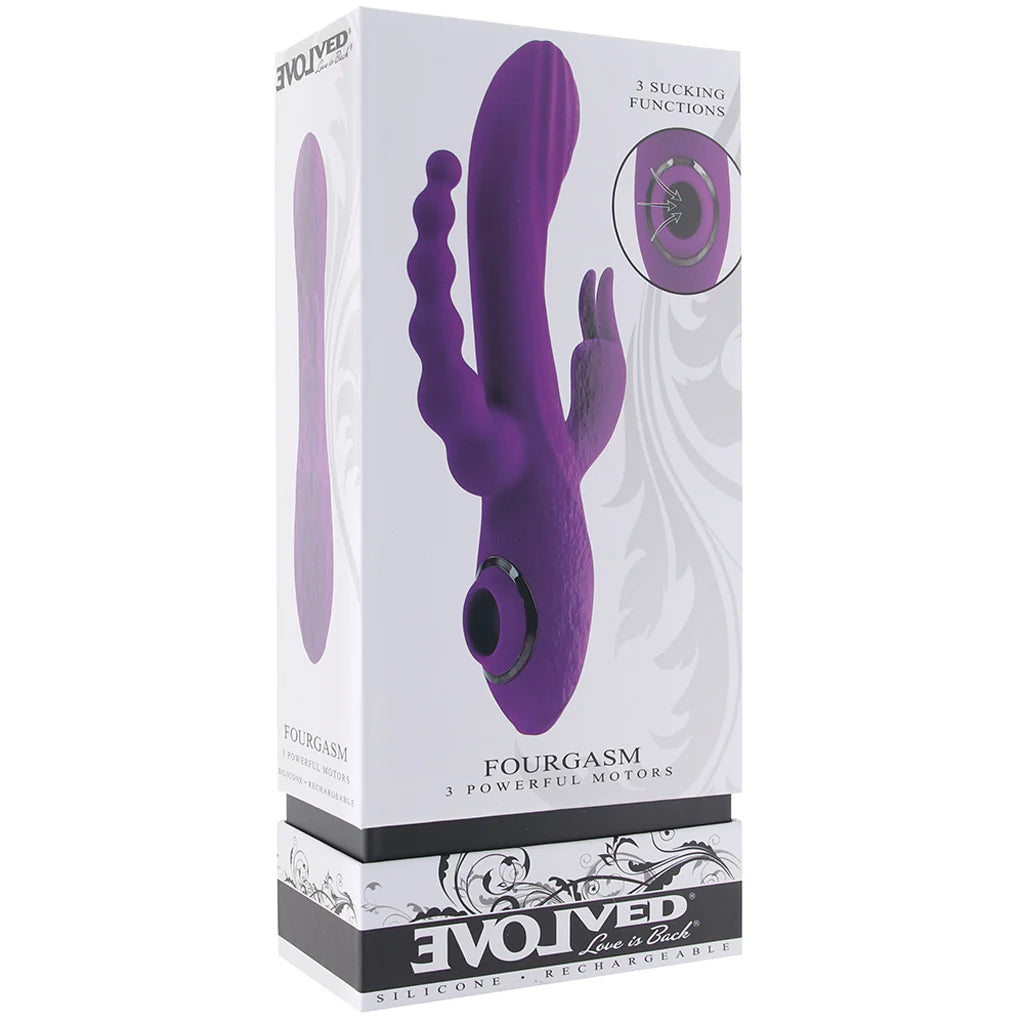 Ready to rack up some serious pleasure points? The Evolved Fourgasm Quad Stimulator delivers four ways to play β and itβs more than ready to earn its name. With a swollen penetrator, a classic bunny tickler, a beaded anal tail, and a suction stimulator, this toy is basically a one-stop orgasm shop.
