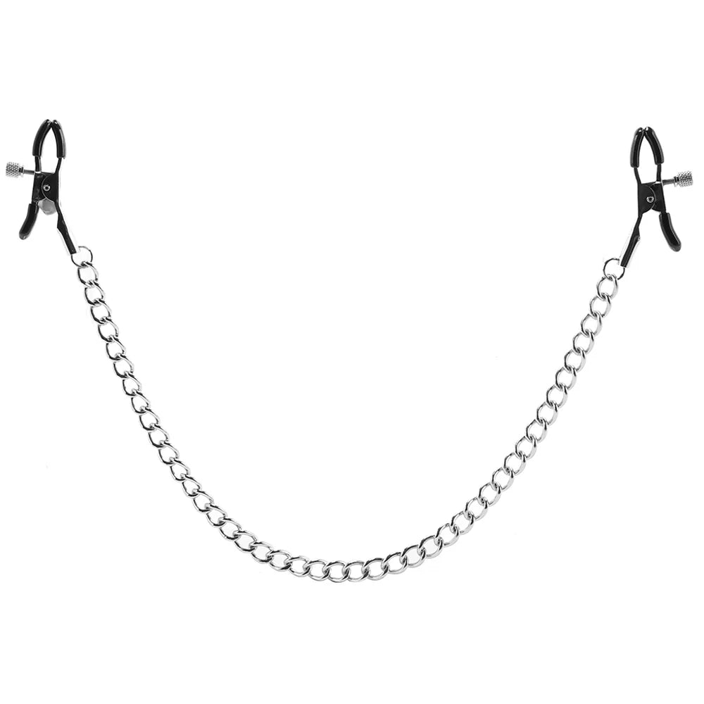 Each clamp features soft PVC-coated tips for comfort and safety, while adjustable screws let you customize the level of pinch. Tug on the sturdy metal chain for added stimulation, or let it swing and tease in sync with every movement.